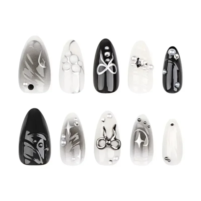 24Pcs False Nails Spicy Girl Silver Bow with Diamond Fake Nails with Glue Almond Press on Nails Black Cool Y2k Almond Nail Set